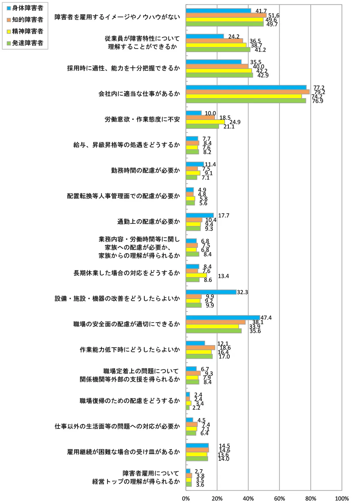 法定雇用率の段階的な引き上げに伴い、障がいのある方を雇用する際の課題として、身体障がい者、知的障がい者、精神障がい者、発達障がい者ともに、「会社内に適当な仕事があるか」が最も多くなっています。(身体障がい者では77.2%、知的障がい者では79.2%、精神障がい者では74.2%、発達障がい者では76.9%)(表2参照)