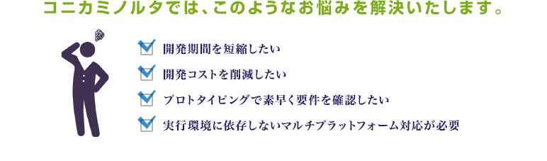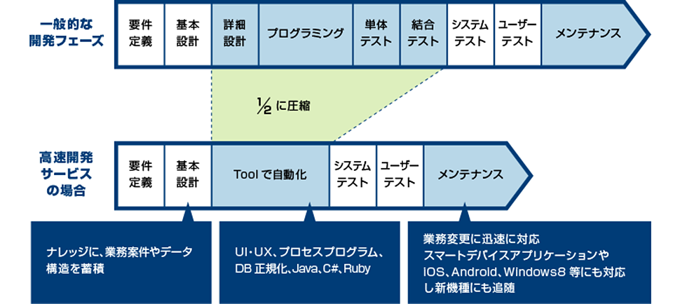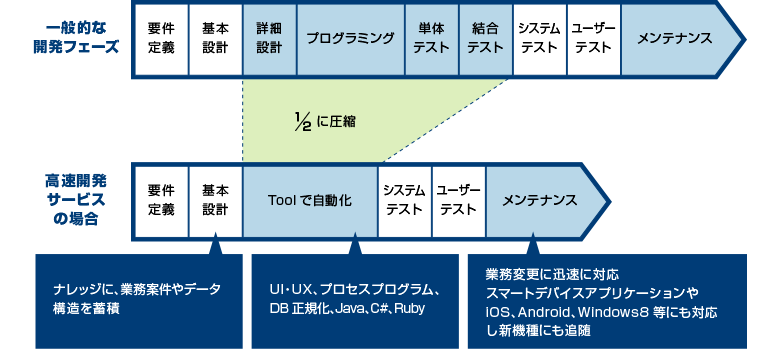 多様なモバイルプラットフォームへの対応も求められる中、一般的なプログラム開発では、開発期間の長さやそれに伴うコストの増大に悩まされがちです。プログラミングやテストにかかる工程を自動化することで、よりタイムリーな市場投入をサポートする高速開発サービスを提供します。