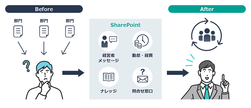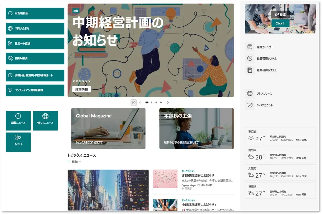そこで、新たな基盤としてMicrosoft 365のSharePointを採用し、経営者からのメッセージ、普段よく使う勤怠や経費システムへのリンク、各部門からの情報発信、ナレッジ共有、問合せ対応窓口の設置をすることで業務に自然に組み込まれるポータルの構築を目指しました。
