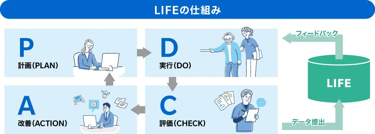 LIFE(科学的介護情報システム)とは、データにもとづく質の高い介護(科学的介護)を実現するための情報基盤です。LIFEの仕組みを正しく理解し、データ提出とフィードバックの活用(PDCA)を適切に循環させることが、科学的介護を実践する上での第一歩となります。