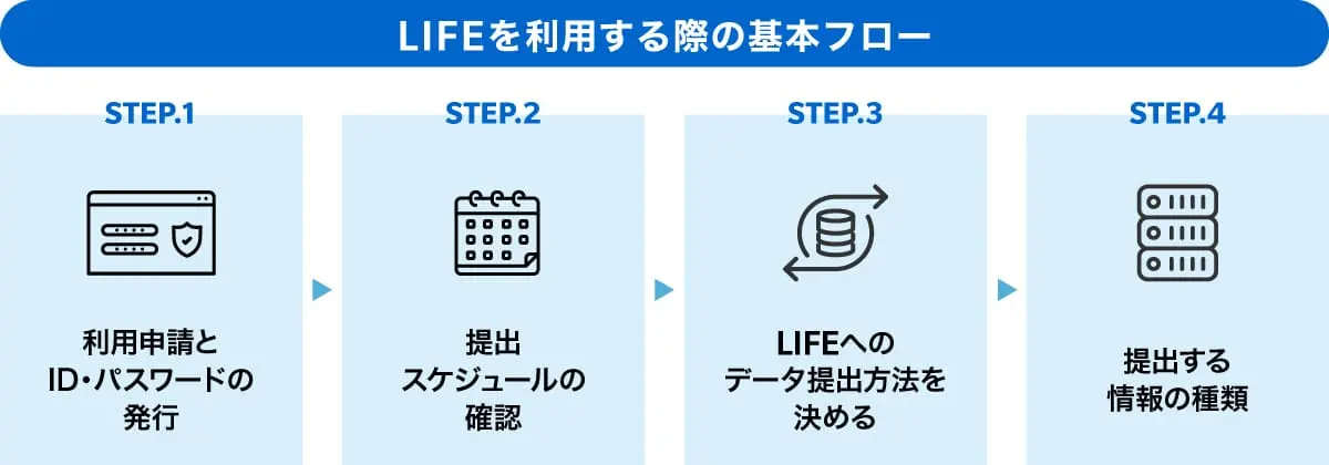 LIFEの利用を開始するには、まず利用申請を行い、定期的にデータを提出し、フィードバックを受け取るという一連の流れを理解する必要があります。ここでは、LIFEを利用する際の基本的なフローを4つのステップに分けて解説します。
