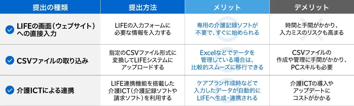 年間の提出スケジュールを把握したら、続いてLIFEへのデータ提出方法を決めます。LIFEへデータを提出する方法は、主に下記の3つのパターンがあります。事業所のICT環境や運用体制に合わせて選択しましょう。