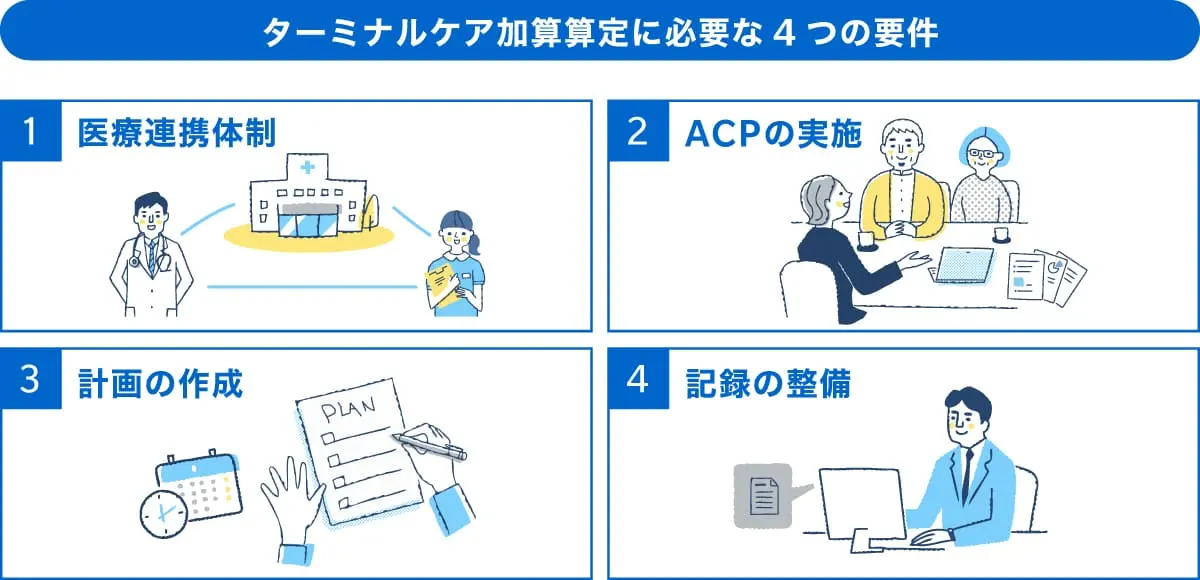 ターミナルケア加算を算定するためには、単に看取りを行ったという事実だけでなく、国が定める厳格な体制要件とプロセスを満たす必要があります。ここでは主な4つの要件について解説します。