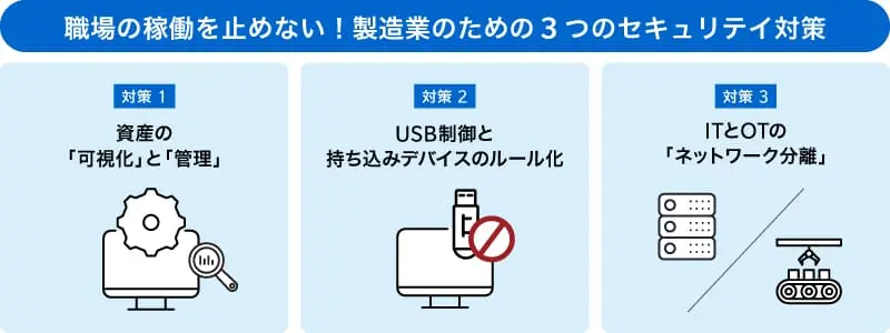 「セキュリティを強化して生産効率が落ちては本末転倒」という現場の不安に応えるためには、工場の安定稼働を最優先に考えた対策が必要です。ここでは、現場の実情に即した3つの現実的な対策を紹介します。