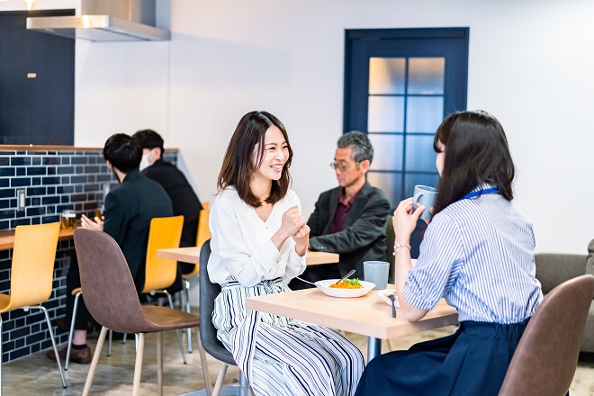 近年は働き方が多様化し、勤務時間帯や勤務日がずれている社員や、オフィス外で業務に携わる社員も増えていくことが予想されます。オフィスに出社するメリットを最大限に活用できるよう、自然なコミュニケーションを引き出す空間として社員食堂を位置づけるのも1つの考え方です。