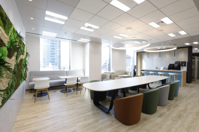 事業フィールドと関わりの深い「海・陸・建設」を軸に、アースカラーやグリーンアートに海の青をアクセントカラーに加えたオフィスデザインです。リラックススペースにも建築を彷彿とさせるコンクリートやセメント調の壁面素材を採用するなど、事業内容とリンクしつつ、心地よく交流できる空間となっています。