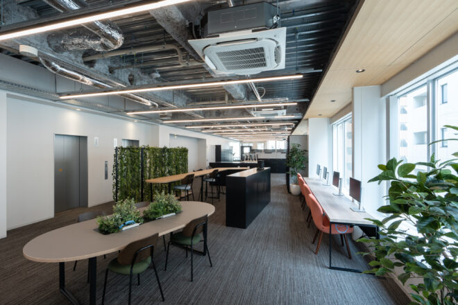 リラックススペースは、この事例のようにフロアの一部を利用して設置することも可能です。植栽でさりげなく周囲の視線を遮ったり、吸音パーテーションを設置したりするなど、工夫しだいでリラックスできる空間を設けられます。