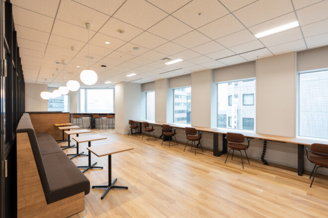 従来は6フロアに分かれていた執務エリアを2フロアにまとめ、もっとも光が入るエリアにリラックススペースを設けました。執務スペースとは異なる開放的な雰囲気にすることで、社員同士の自然な交流が生まれる場となっています。