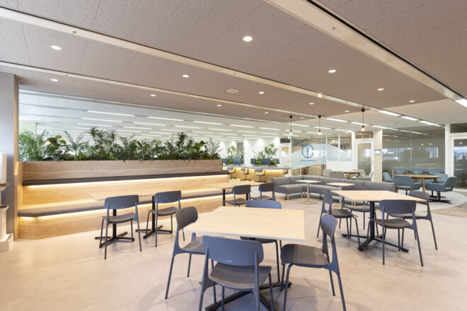 リラックススペースは、企業イメージとリンクする場所となることも考えられます。この事例のように、自社の事業と関わりの深い配色やデザインを取り入れることは、企業ブランドの強化にもつながる効果をもたらすでしょう。