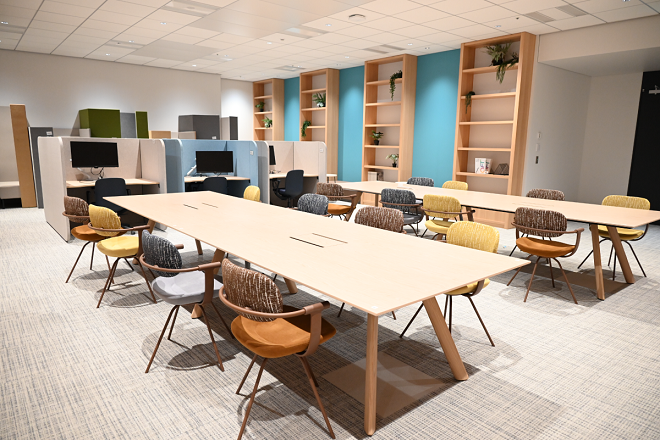 はい。ここには自由に使える大型テーブルのほか、集中デスクも設けています。予約制で1回あたり最大2時間まで利用可能です。実は旧オフィスでは集中デスクを約50席ほど設置していたのですが、数が多すぎて固定席のように使われてしまうケースもありました。今回はその反省を踏まえて11席に絞り、必要最低限の数にとどめています。