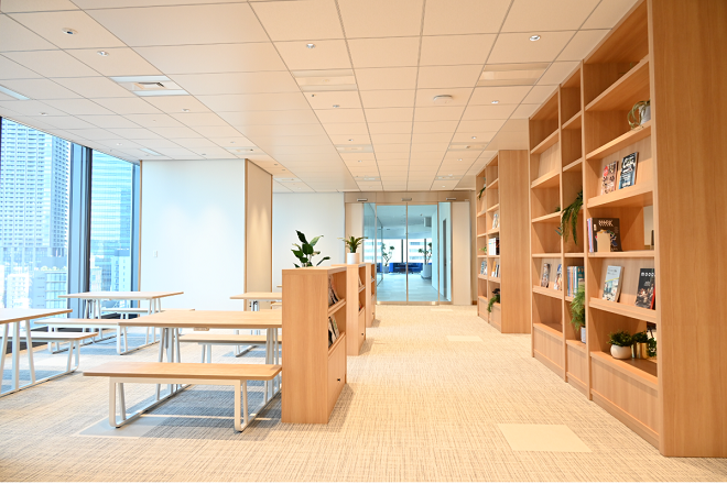 オープンしたばかりなので、まだ棚には空きも多いですが、これから資料や書籍を充実させていき、社員の皆さんのインプットを支える空間に育てていきたいと考えています。イメージとしては図書館というよりも、会話しながら互いの知識や気づきを高め合える、ナレッジの交流拠点がテーマですね。