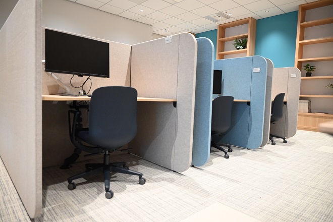 集中して作業に取り組みたい場合に使用できる一人用のブースです。ドアと天井が付いているクローズ型、天井のないセミクローズ型、ドア・天井のないオープン型の3種類があります。