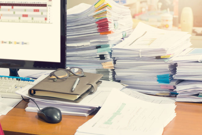現時点で保有する紙文書の量を把握したら、次はどれぐらい紙文書が発生しているかを把握しましょう。目の前の紙文書を減らしても、新たに発生する紙文書が多ければ元の木阿弥です。紙での運用になっている業務プロセスを洗い出し、ルールや処理の変更が可能であるかを検討します。ターゲットとしては、発生量が多く単純な業務で発生する紙文書から手を付けるとよいでしょう。なお、紙を生まないための施策としては文書管理システムやワークフローシステムなどのICTツール導入が有効です。