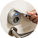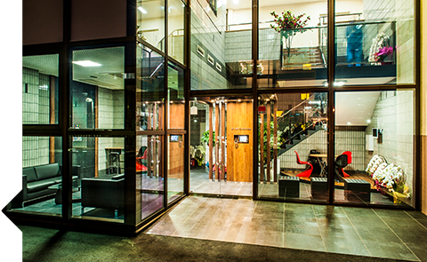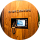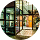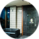 リニューアル後のエントランスは、壁面・床面タイルの硬質感と、木のやわらかな質感を巧みに組み合わせたシックなイメージに仕上がりました。入り口正面のパネルには、タブレット端末で担当者を呼び出せる受付システムを配置。待合・打合せスペースには、スタイリッシュなチェアやソファーを配し、効果的な照明と相まって洗練されたおもてなし空間をつくりあげています。