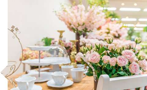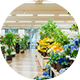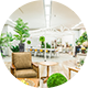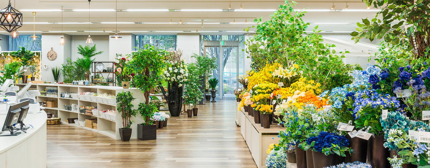 商材を詰め込み過ぎないゆったりしたレイアウトや、商品カテゴリーではなくカラーリングで分類された見た目にも映えるディスプレイ、店舗内を無理なく自然に回遊できる動線などで居心地のよい空間を実現。また、お客様にお楽しみ頂けるお花の教室、季節の催し、講演会などの活用を想定し、白い木製のヤグラの下にテーブルセットが置かれたスペースを設置。