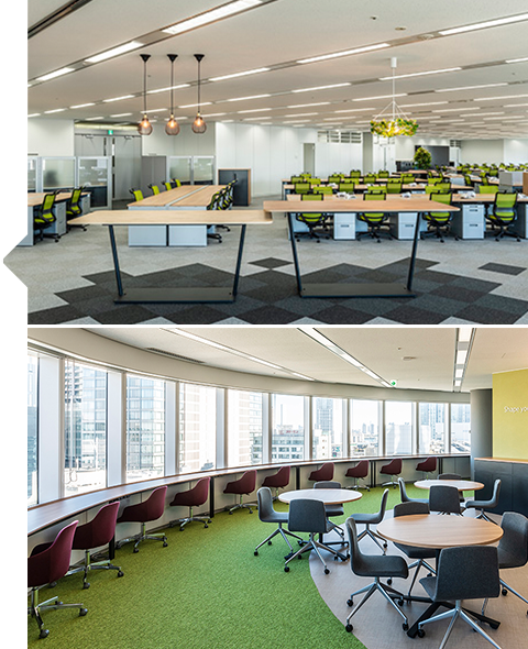 品川インターシティビルのオーバルな形状を活かした斬新なプランニングで、オフィス内は部門の仕切りがなく、フロア全体が見渡せるメガ・オフィスレイアウトを採用。広々とした空間には、通常の打ち合わせスペースに加え、立ちミーティングデスク、ファミレス席など数多くの打ち合わせスペースを設定。