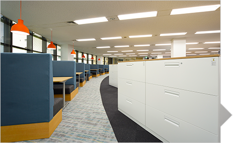 社内に保管している紙文書は、積み上げると高さが富士山8合目に相当するほど大量に存在していましたが、当時の30%にまで削減。キャビネットの数が少なく、開放的で明るい雰囲気のフロアに。