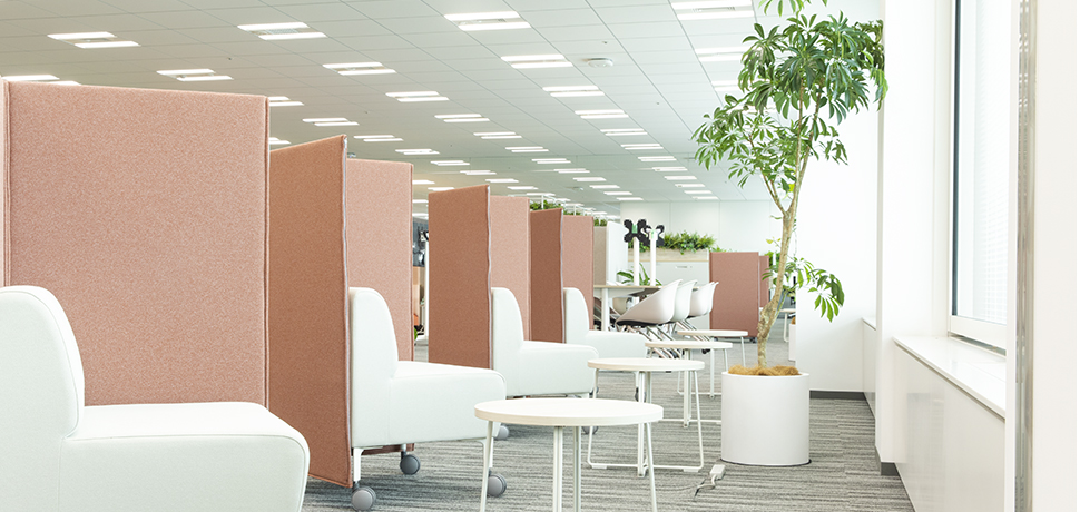 働き方への意識が大きく変わる中、20年先の長期ビジョン実現に向け、本社オフィスをワークプレイスと生活空間がリアルとデジタルでつながる次世代オフィスへリニューアルしました。他部門との交流地点には、オフィスの大切な役割であるリアルなコミュニケーションを多く取ることが出来るよう、様々なコラボレーションスペースを配置しています。また、オフィスでの業務効率を上げるため、集中ブースやWEB会議ブースといった新しい要素も導入しました。ひとりひとりの能力を最大限に引き出す自部門の業務遂行と他部門との交流推進を両立させるオフィスです。