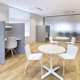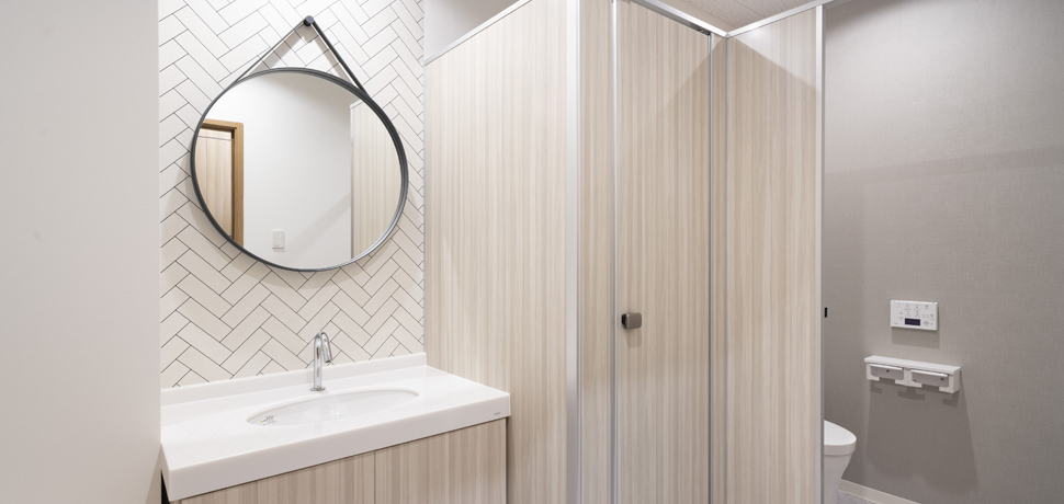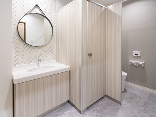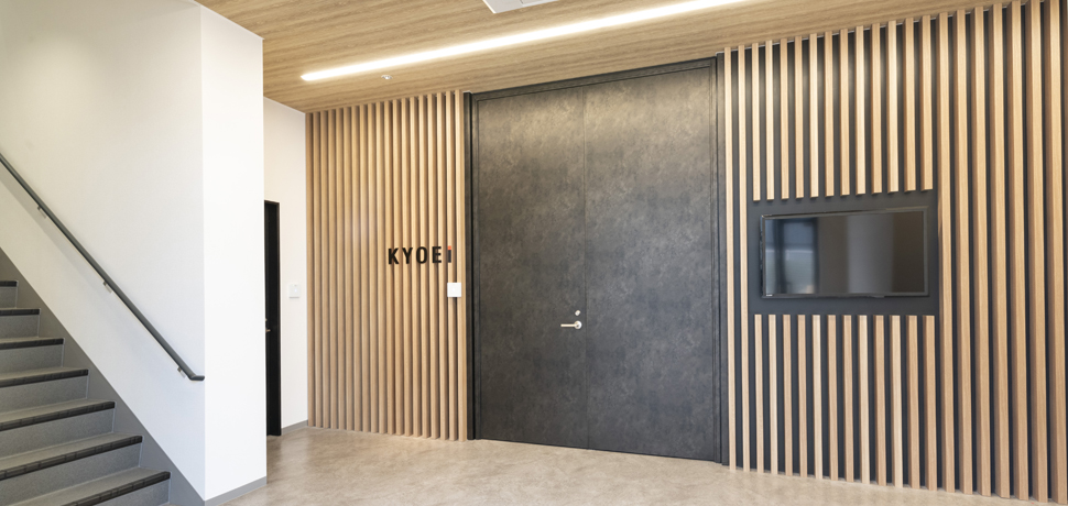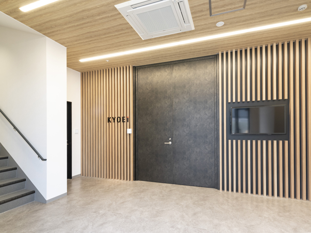 外装はシックでモダンな中にも社名サインが際立つデザインや素材を採用し、お客様を迎えるエントランスやショールームのデザインは外観とのつながりを意識しながらも温かみのある木目調で統一、間仕切りにはガラスを使用することで開放的な空間としました。また、2階は木目と調和する優しい色合いのオフィス空間へと生まれ変わり、社員のモチベーションアップや企業イメージの刷新を実現することができました。