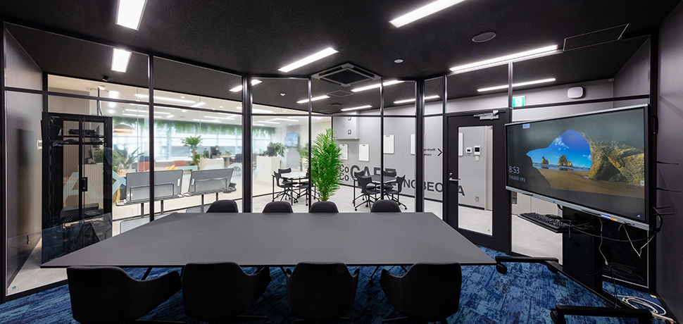 社員を含め、日々訪れる多くの方が働く共創スペースには、可動式や立ちミーティングエリアなど様々な場面で利用できるオープンな打ち合わせスペースを多く取り入れました。また、空間を分ける壁面にはガラスを採用し内外の隔たりを軽減しつつ、自然溢れる延岡をイメージしたグラフィックデザインを採用するなど、限られた空間の中でお客様の想いを散りばめ、地元への親しみと、“交流”を大切にする空間となりました。