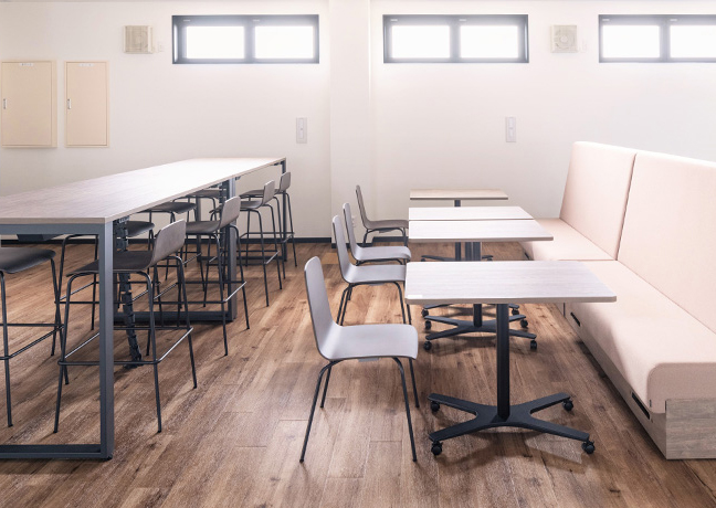 1階には一元管理が可能な倉庫、関係者がスムーズにデスクワークができるよう動線を考慮して更衣室や執務エリアを、2階はフリーアドレスを導入し、立ちながら気軽にコミュニケーションが取れるスタンドミーティングスペースや個人ワークに特化した集中エリア、リフレッシュスペースなど多様な環境を構築しました。