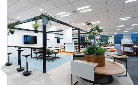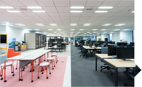 かつてのイメージを覆す明るく洗練された雰囲気のデザインを採用。さらにフリーアドレス制に移行し、「コラボレーション」「集中」「リラックス」など、機能の異なるスペースを設けて柔軟な働き方を実現するABWオフィスを整備。他部署とのコミュニケーション促進、出社意欲の向上を実現した。