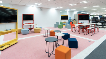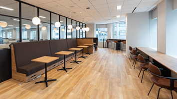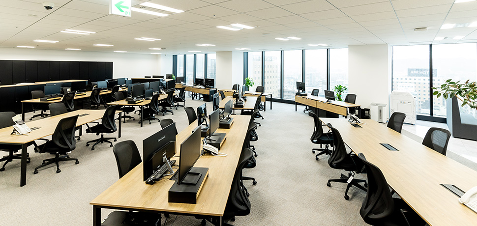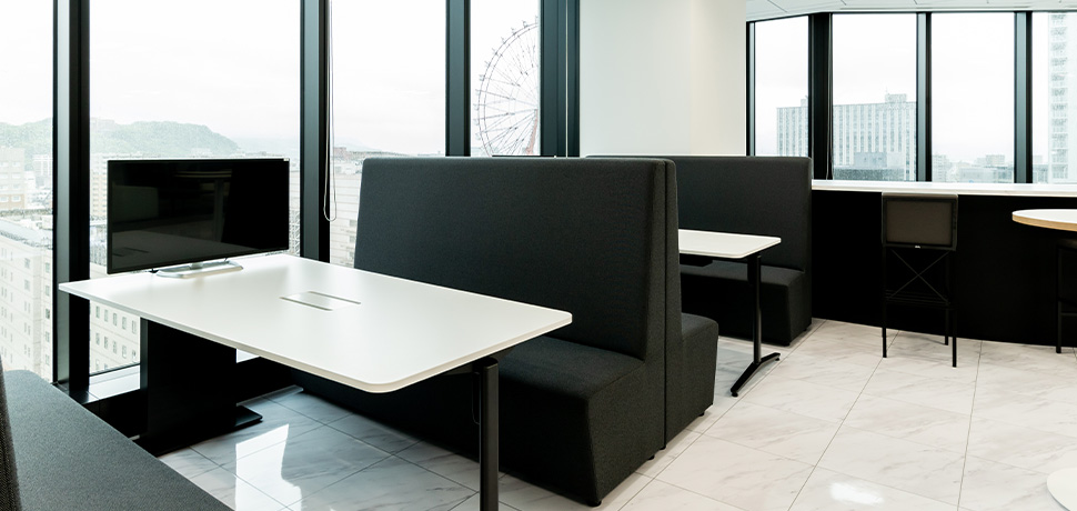 県内外へ加速する事業・店舗展開に伴い、優秀な人材の確保が急務となっていた国分ハウジンググループ。採用戦略のひとつとして、鹿児島のランドマークとなるビルの最上階角地という、アクセスと眺望に優れたオフィスへ本部を移転しました。桜島が見える景観の良いエリアに応接室を設けるなど、来社時に「ここで働きたい」と強く感じてもらえる仕掛けを随所に散りばめた遊び心のある空間を実現。また、オンライン会議用の1人用個室ブースや、窓際のオープンなファミレス席など、働き方に合わせて環境を選べるほか、終業後はバーカウンターにもなるカウンターテーブルを設置。宴会利用も可能な環境とすることで、社内交流を促進するなど、福利厚生にも寄与するオフィスとなりました。
