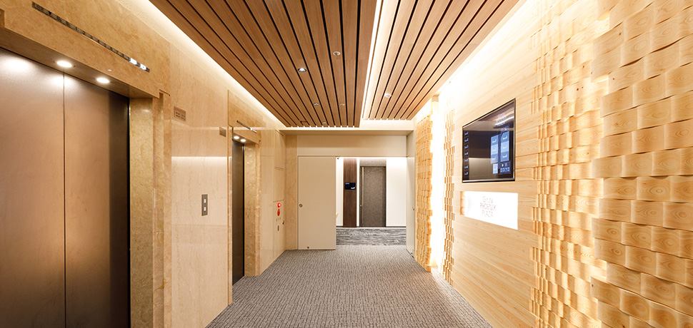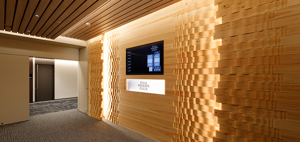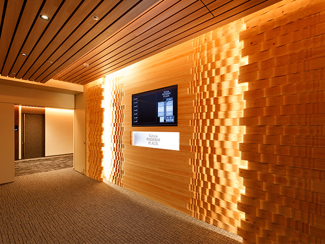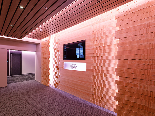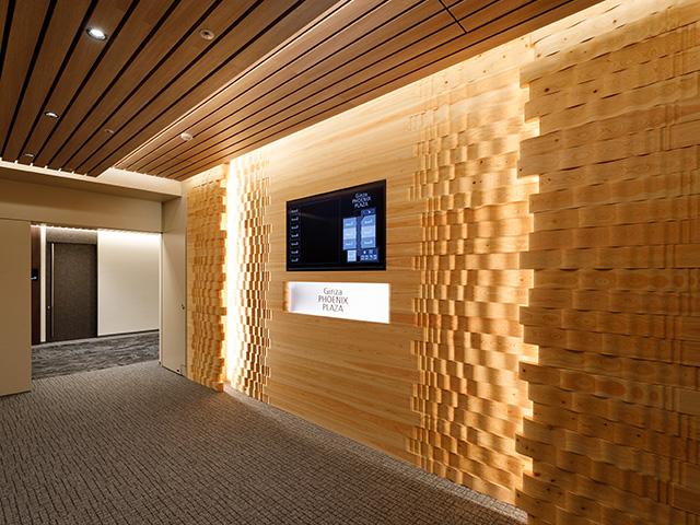 事業のあゆみを“木のぬくもり”で感じるエントランス