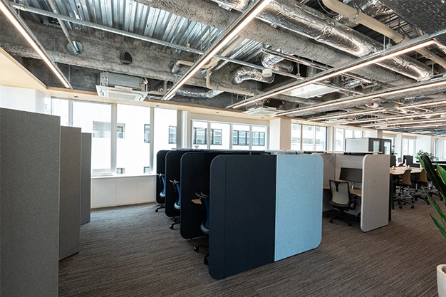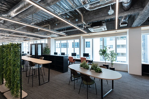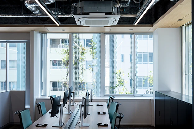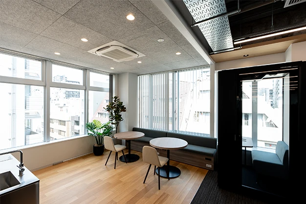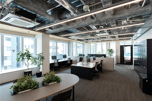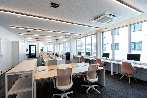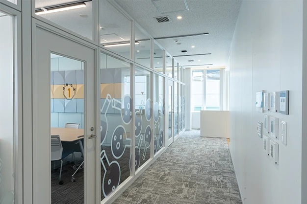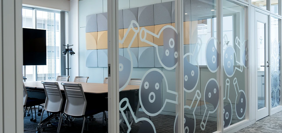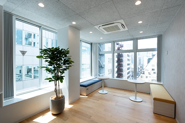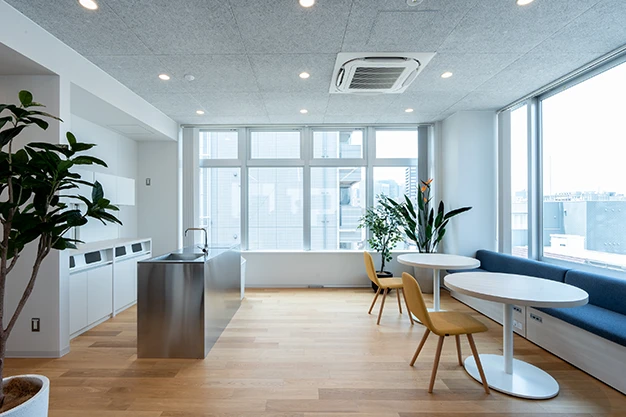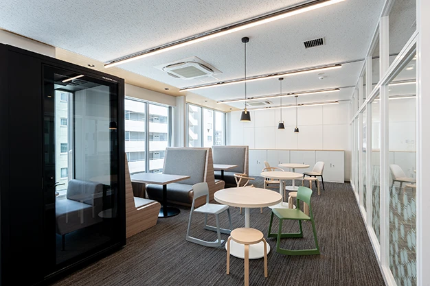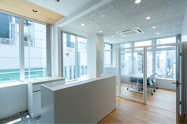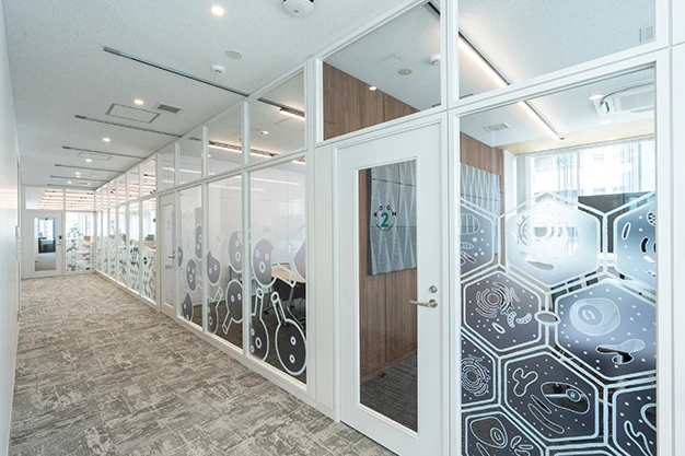 社員が集まり、創造し、想いが繋がる「“集う”オフィス」は、2つのフロアをそれぞれの目的に合わせて空間を演出しています。快適さを重視した6階は、グリーンや落ち着いたトーンを基調としたカジュアルなデザインに。また、中央にはカウンターテーブルを設け、偶発的なコミュニケーションが生まれる工夫を施しました。エンゲージメント向上を意識した8階は、白を基調とし透明ガラスを特徴とした明るく開放的なデザインに。来客エリアには試薬会社ならではのグラフィックをあしらい、お客様に信頼感を与える清潔なイメージに仕上げました。