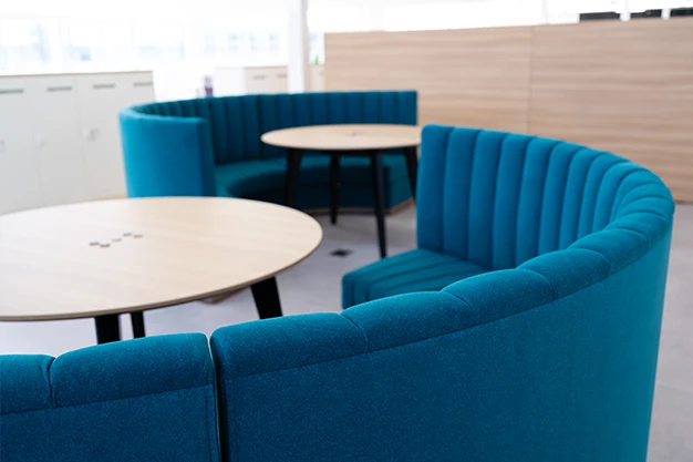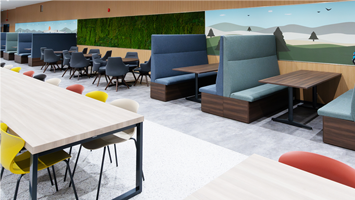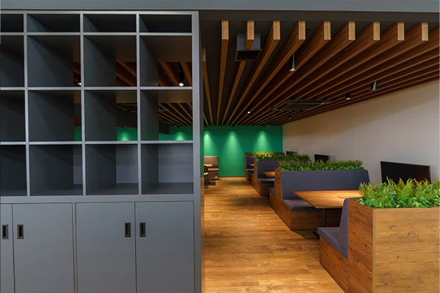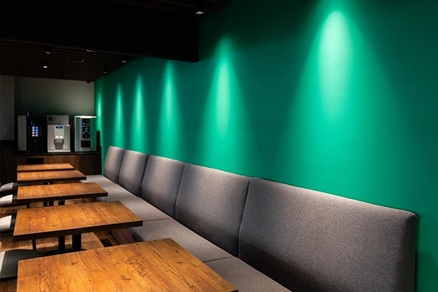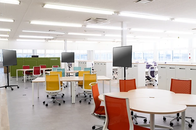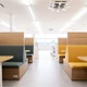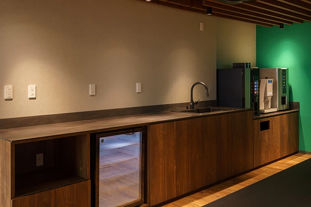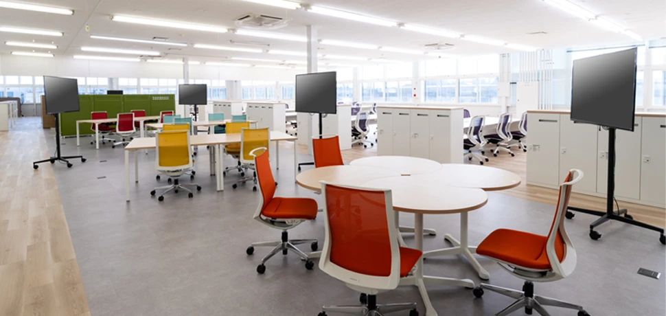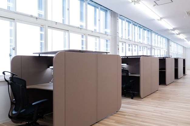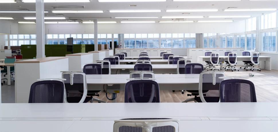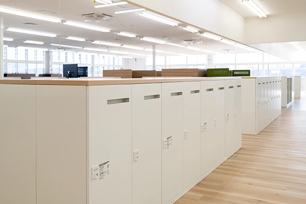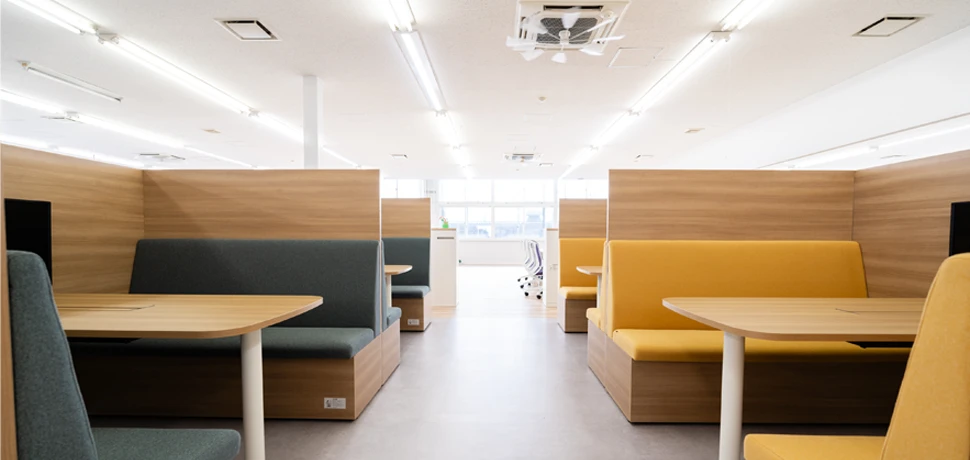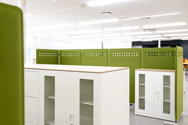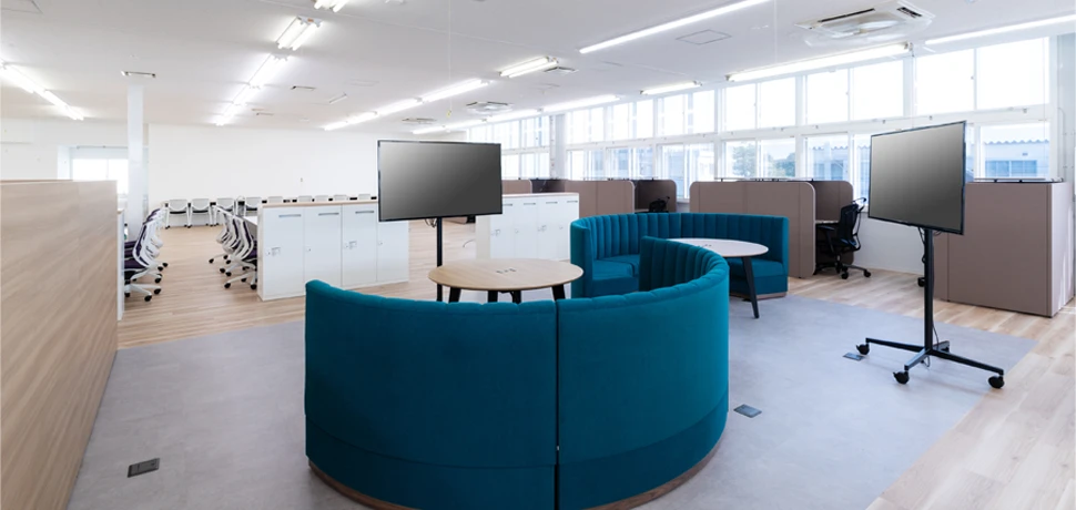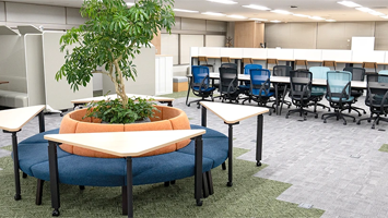 より多くの部門間コミュニケーションの促進に向け、「ライトなコミュニケーションがあふれる職場」をビジョンにオフィスをリニューアルしました。執務室は大きく4つのエリアに分割し、各エリアはソロワークエリアで、隣接する導線にオープンなミーティングエリアを配置。個人ワークとチームワークの行き来がしやすいレイアウトにすることで、新たな接点や自然なコミュニケーションを促します。また、半個室のラウンジはグリーンや照明、天井のデザインにも工夫を凝らし、ほどよい囲まれ感により落ち着いて会話ができる環境に。執務エリアとラウンジという雰囲気のまったく異なる2つの空間によって、部門やプロジェクトを超えたコミュニティが生まれるオフィスとなりました。