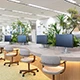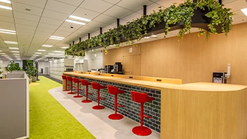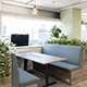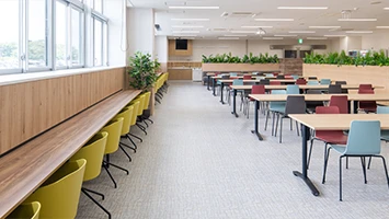 オープンで明るくコミュニケーションが生まれる空間を目指し、オフィスをリニューアル。彩り・出会い・想いが「めぐる」をコンセプトに、世界中の海をめぐる事業をイメージしたグラフィックを施したガラス壁面や波打つ海を彷彿とさせるカフェエリアなど、彩り豊かな空間に仕上げました。執務エリアはフリーアドレスのほか、部門内の連携がとりやすいようグループアドレスを採用。また、曲線が特徴的なピーナッツ型のビッグテーブルには植栽を取り入れ、一人ひとりが心地よく働ける環境を実現しています。