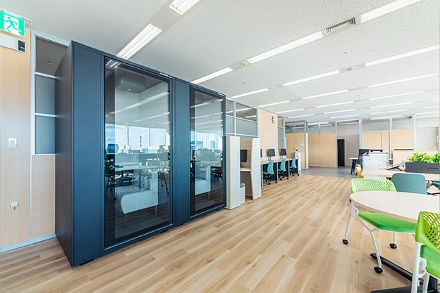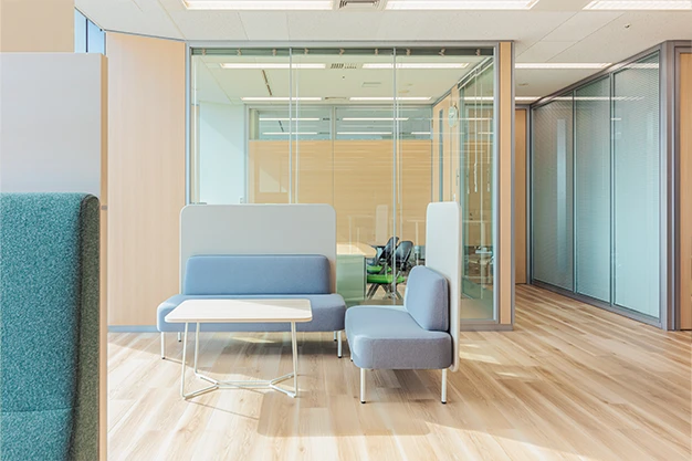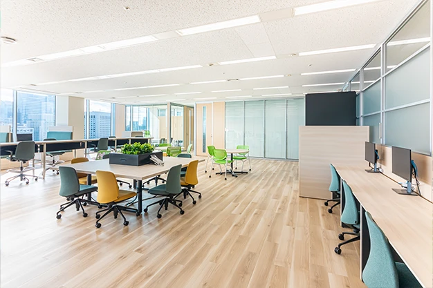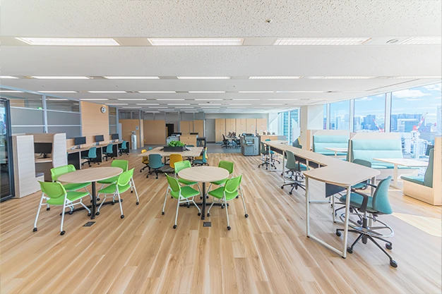 フリーアドレス席の導入や、ナチュラルなデザインで統一された多様なワークスペースを設計し、コミュニケーションの活性化と業務効率向上を両立しています。社員が出社したくなるような「遊び心のあるレイアウト」が特徴で、働きやすさとデザイン性を兼ね備えたオフィス空間を実現しました。