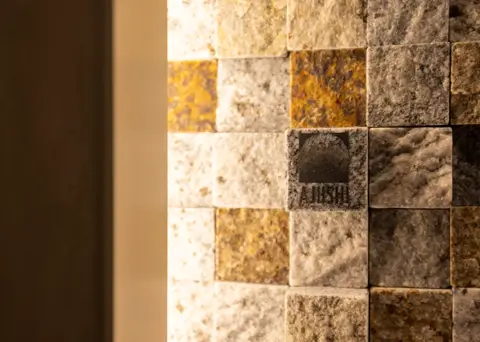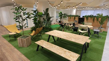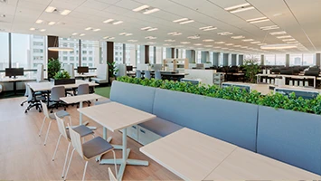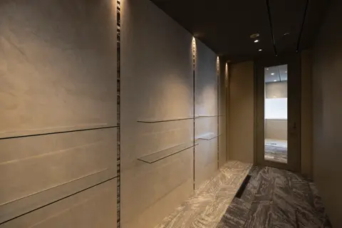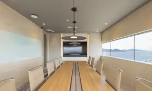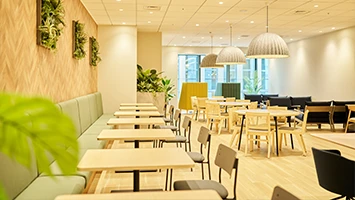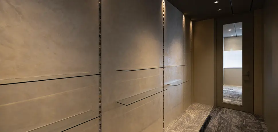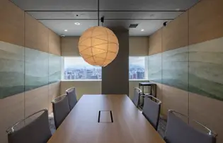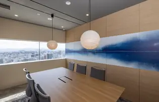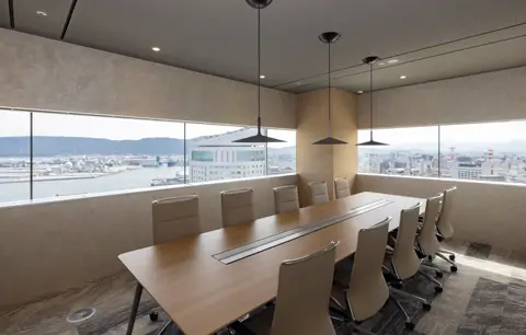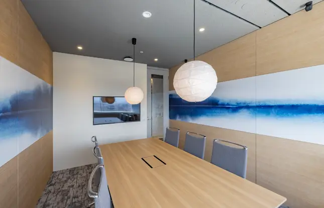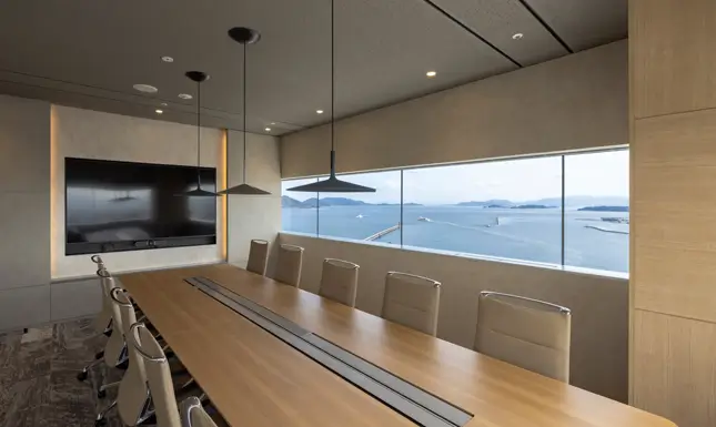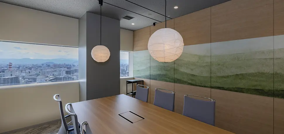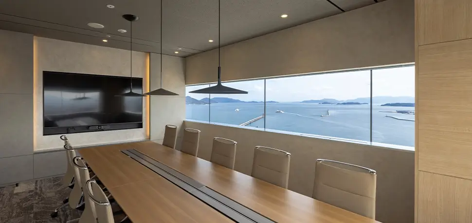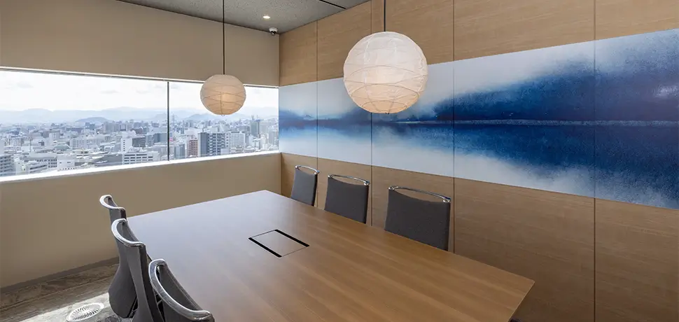ブランドの「価値」と「存在感」の向上を目指しオフィスを移転。エントランスには地域ゆかりの「庵治石」のモザイクタイルを採用し、洗練された印象を演出。さらに、メタリックな光沢が美しい左官壁や間接照明を組み合わせ、高級感と温かみのある空間を実現しました。3つの会議室はそれぞれ水平窓が切り取る美しい眺望を活かしたデザインに。水平線が見渡せる大会議室には、窓の景色が映り込んで反射するよう、カラーガラスを配置。町並みが見渡せる小会議室では、高松の海と山をイメージしたアートを配置して連続性を意識しました。