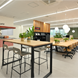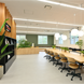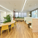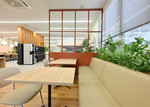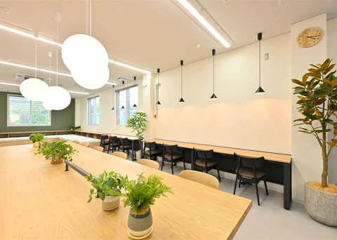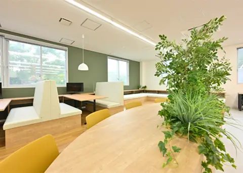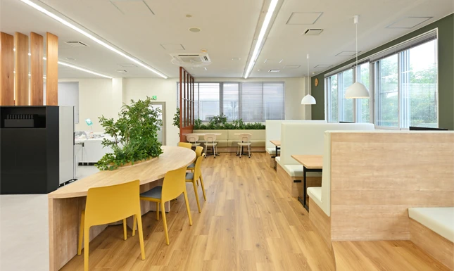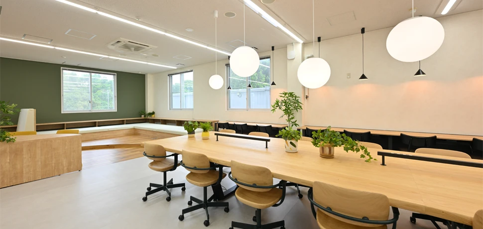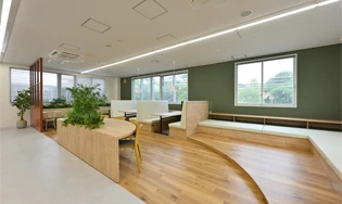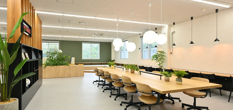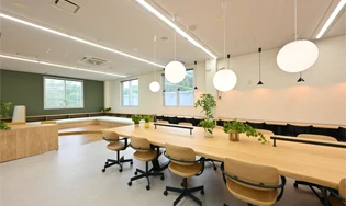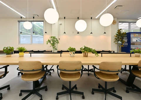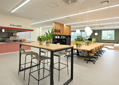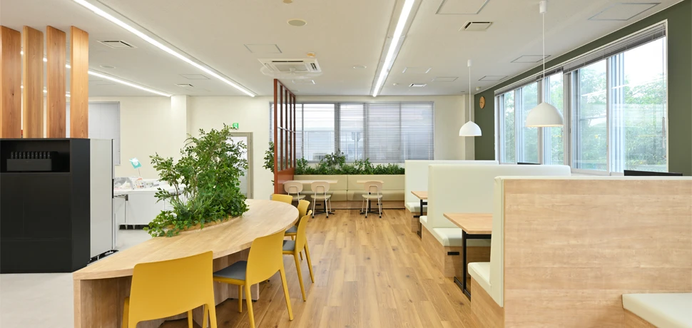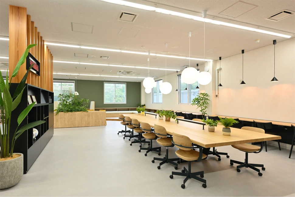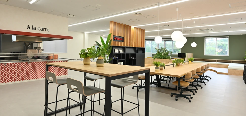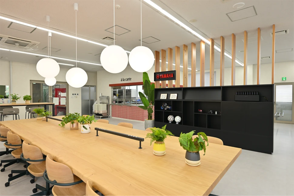 社員食堂を「”食事をする場”から”食事もできる場”へ」という想いを実現すべく、“新しいアイデアや働き方に出会える実験場=Meet LAB”をコンセプトにリニューアル。空間には、食堂と所在を同じにする静岡県に生育する日本三大美林のひとつ「天竜杉」を使用したルーバーを設置し、木の温もりと地域性を演出。コワーキング席や多目的に活用できるオープンミーティングエリア、「飾り・集わせ(つどわせ)、隠す」という3役を備えた造作棚など、思わず足を運びたくなる仕掛けをふんだんに取り入れ、従業員が自然と集い、交流し、リフレッシュできる居場所を実現しました。