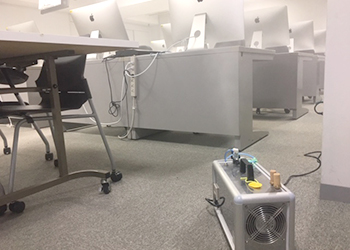 多くの学生が授業を受ける広い講義室は、前からと後方に機械をセットします。