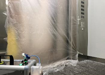 「密」になりそうなエレベーターもドアを養生して噴射していきます。