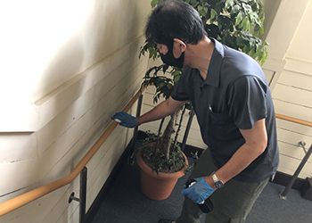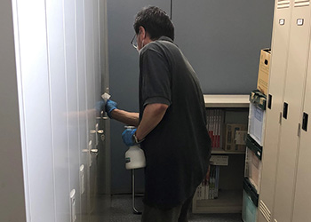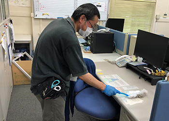机の上やロッカーのドアノブなどよく触りそうな箇所を重ねてデルフィーノ液で加工していきます。