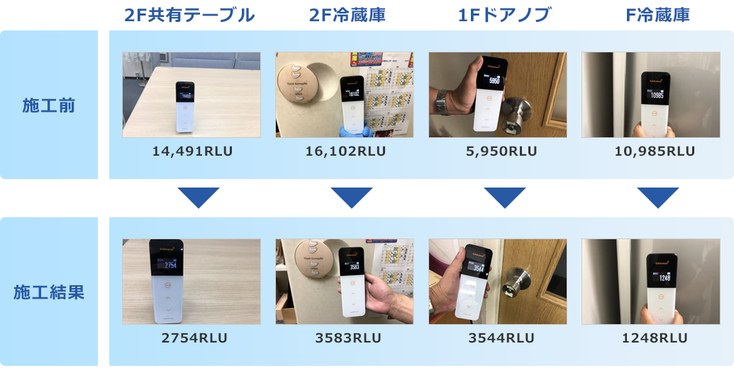 ※ATPふき取り検査:すべての生物の細胞内に存在するATP(アデノシン三リン酸)を酵素などと組み合わせて発光させ、その発光量(Relative Light Unit;RLU)を測定します。