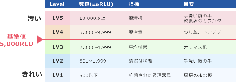 ※ATPふき取り検査:すべての生物の細胞内に存在するATP(アデノシン三リン酸)を酵素などと組み合わせて発光させ、その発光量(Relative Light Unit;RLU)を測定します。