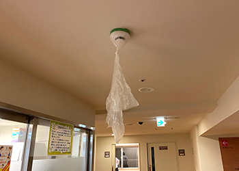 噴霧前に、火災報知器など必要な箇所を養生します。