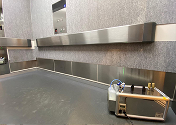 エレベーターにも噴射を行い、手すりやボタンなど全体に施工していきます。