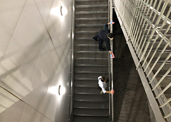駅のホームへ続く階段の手すりも隅々まで施工します。