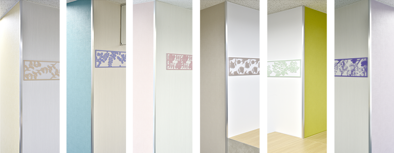 仙台オフィスでは、東北6県の花をモチーフにしたサインパネルと壁紙の色を合わせました。