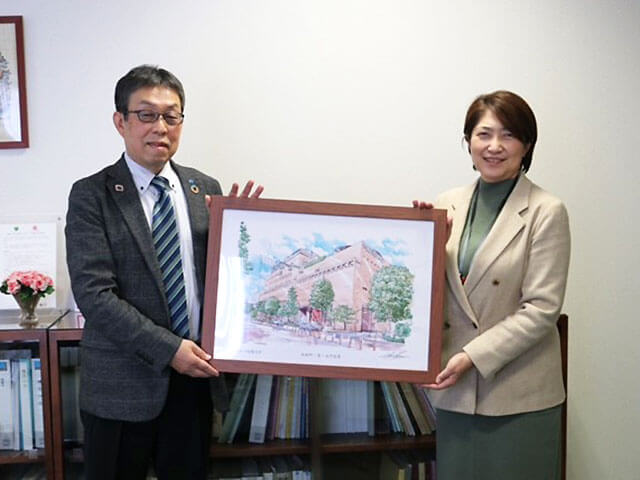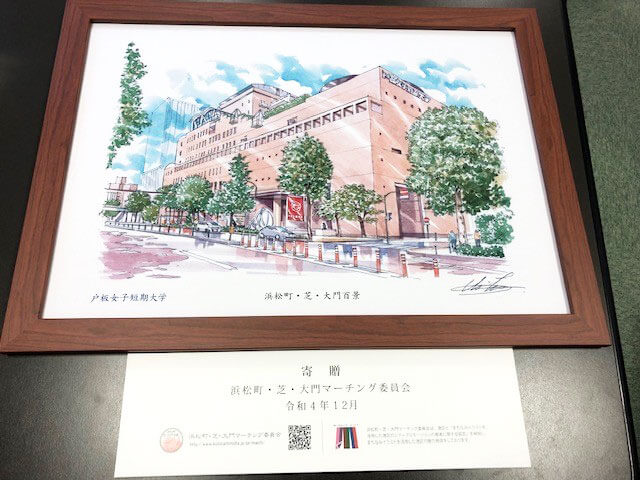 浜松町・芝・大門マーチング委員会では、2022年12月8日に戸板女子短期大学にイラストを寄贈させていただきました。贈呈式では、同大学の白川はるひ学長にA2サイズのレプリカをお渡しして学内に掲示していただくことになります。