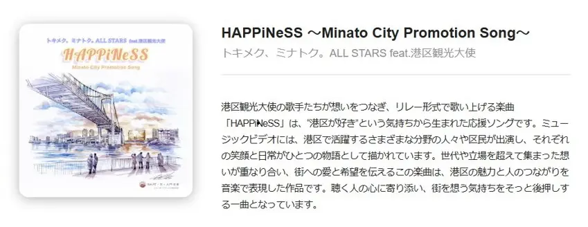 浜松町・芝・大門マーチング委員会は 令和7年度MINATOシティプロモーションクルー認定事業「トキメク、ミナトク。応援ソングプロジェクト」の中で「HAPPiNeSS ~Minato City Promotion Song~」のミュージックビデオ の制作協力を行いました。2026年3月30日より様々な音楽配信サイトにて配信が始まり カラオケBOXで歌えるようになりました。