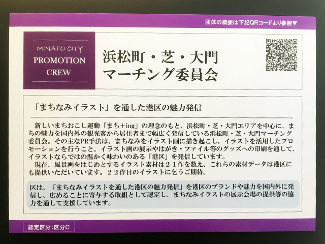 浜松町・芝・大門マーチング委員会では、港区より平成29年度「MINATOシティプロモーションクルー認定事業-C区分」を受けており、みなとパーク芝浦1階共用ロビーにおいて、当会の取組み概要と百景イラストの展示をご紹介いただけることになりました。