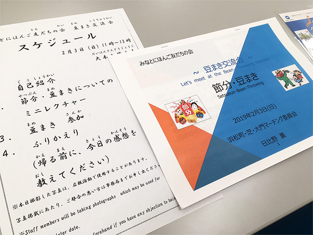 | 協力内容 | 港区国際交流協会が主催する、増上寺の「節分追儺式」に合わせて、参加者が日本文化である「節分」についての理解を深め、「豆まき」を楽しみながら「やさしい日本語」で交流するイベントに参加された外国人と日本人の方々への事前レクチャーの講師として、当委員会代表の日比野が登壇しました。 |