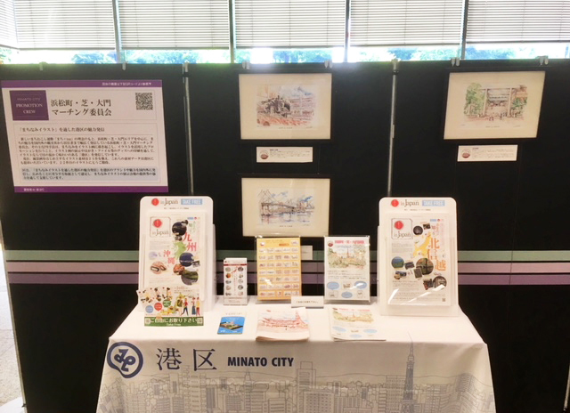 浜松町・芝・大門マーチング委員会では、港区より平成29年度「MINATOシティプロモーションクルー認定事業-C区分」を受けており、今年も区役所本庁舎 1階ロビーにおいて、当会の取組み概要と百景イラストの展示をご紹介いただいております。