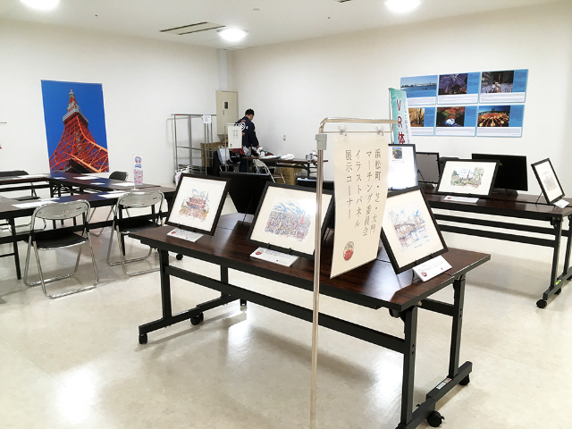 港区では、鹿島ショッピングセンター「エブリア」1Fで、2019年8月3日~4日の2日間、港区の観光PRを実施しました。展示品の中で、浜松町・芝・大門マーチング委員会が所有のイラスト風景画 8点の展示紹介も行いました。