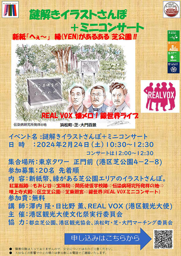 | 内容 | 新紙幣に縁がある芝公園エリアのイラストさんぽ 紅葉館跡 ⇒ もみじ谷 ⇒ 宝珠院 ⇒ 開拓使仮学校跡 ⇒ 伝染病研究所発症の地 ⇒ 増上寺大殿 ⇒ 区立芝公園 ⇒ 芝東照宮 ⇒ 銀世界(REAL VOXミニコンサート) |